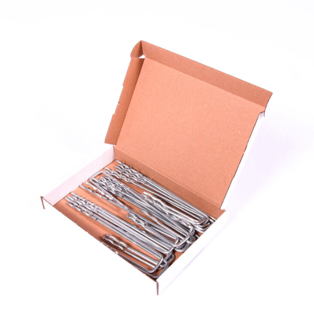 Alumiiniset kiinnityskoukut on muotoiltu tarkoitukseensa ja ne vasaroidaan maaperään, tarjoten hyvän kiinnityksen alustaansa.
