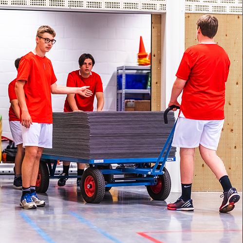 Kukin vakiokärry kantaa n. 250 m2 palamattoja-laattoja, joten tavanomainen koulun liikuntasalin lattia tarvitsee vain reilun 4-8 m2 lattiatilaa säilytykseen.