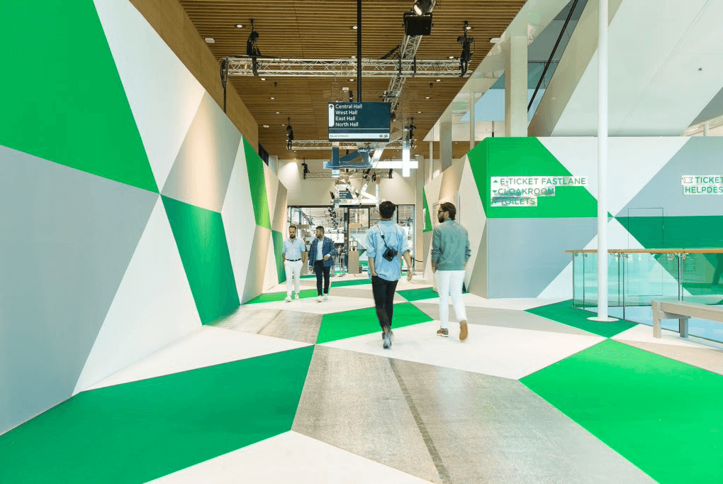 Valkoinen messumatto luo tiloihin avaruuden tunnetta ja tuo valoa.
